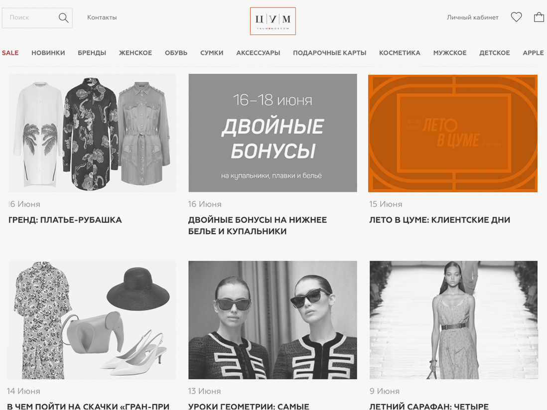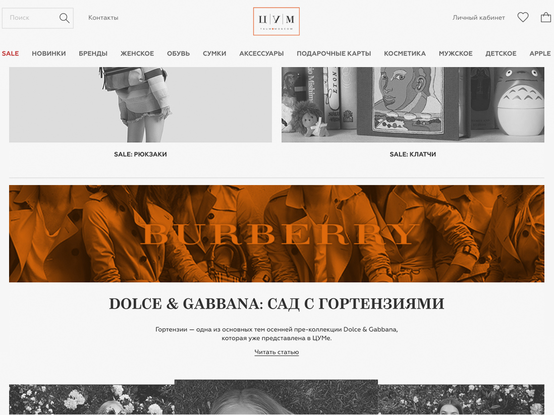 1. Banners on tsum.ru home page. 2. Full editorial home page branding. 3. Banners on editorial page (1170x145 / (360x442). 4. Fixed content on editorial page.